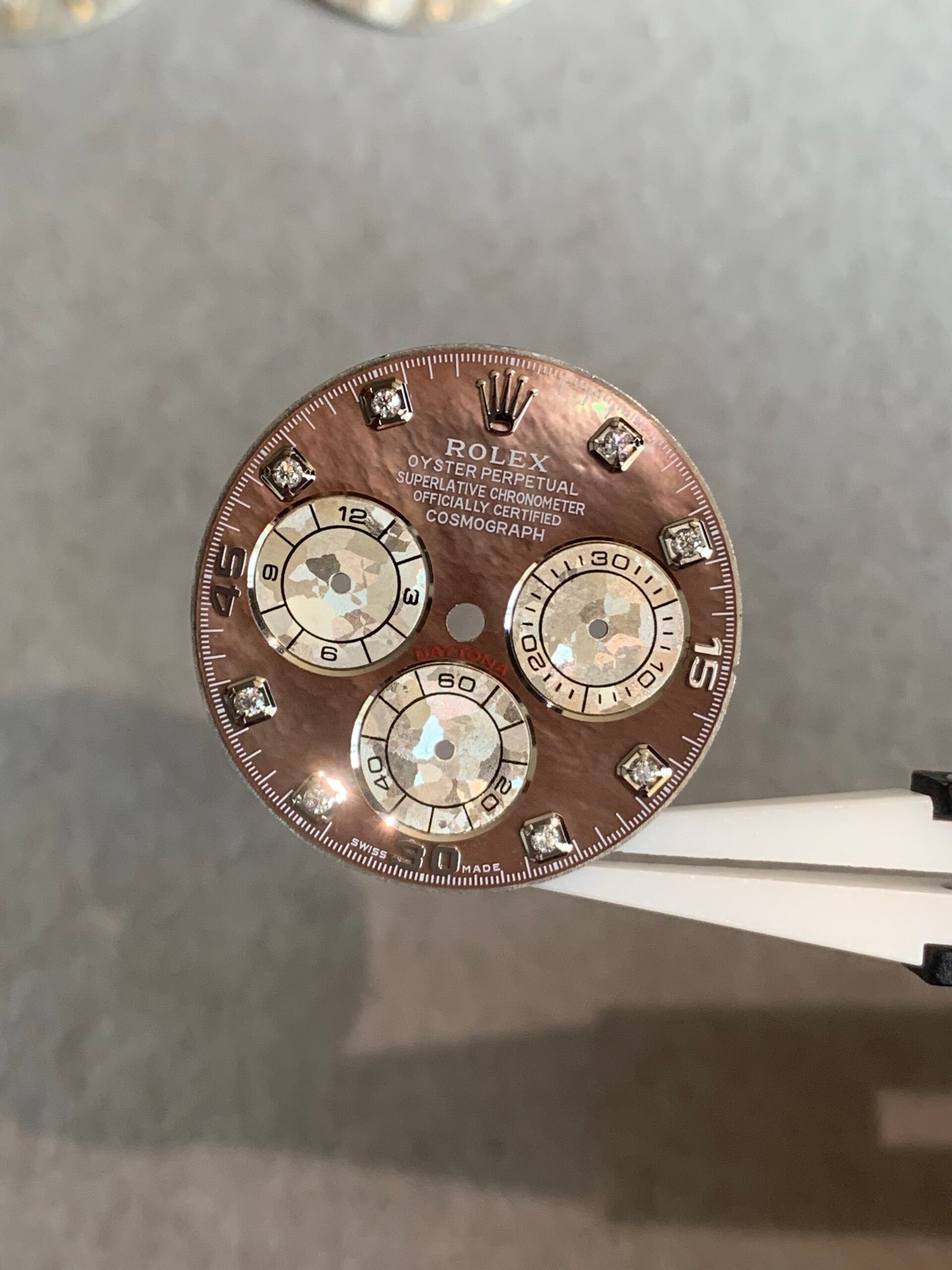Daytona Tahitian black mother-of-pearl dial, three-eye large flower design, with Moissanite diamond scale, suitable for 4130/4131 movement, the dial has a natural texture, excellent fire, and the small eyes have a strong three-dimensional sense.